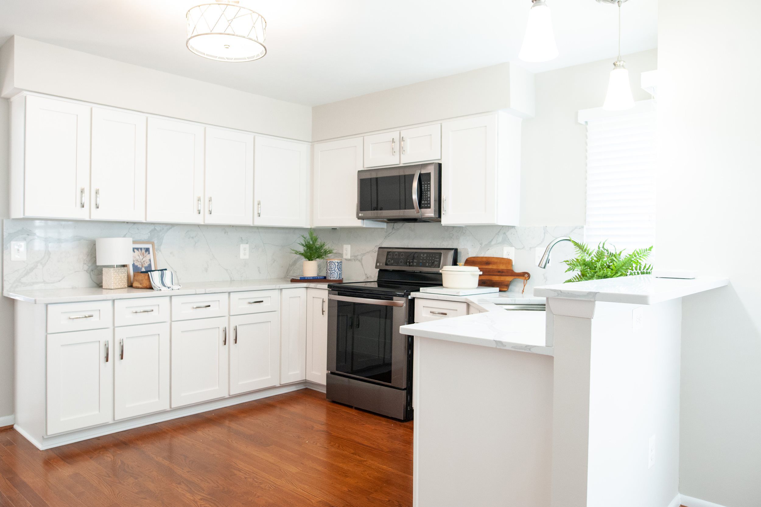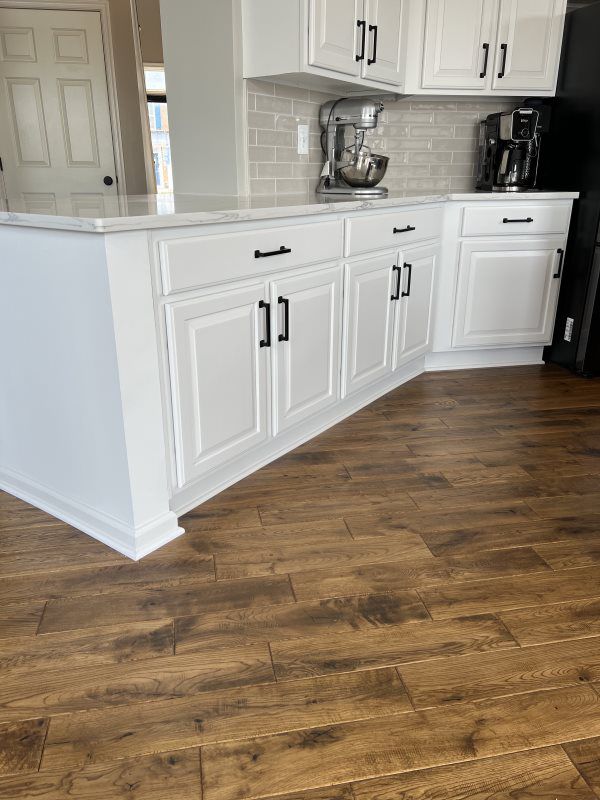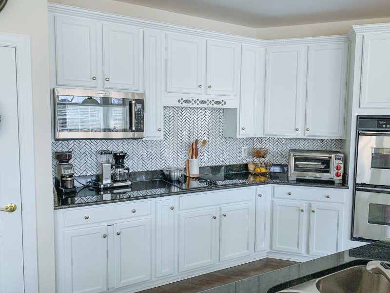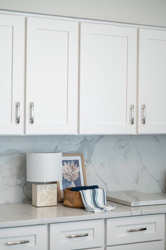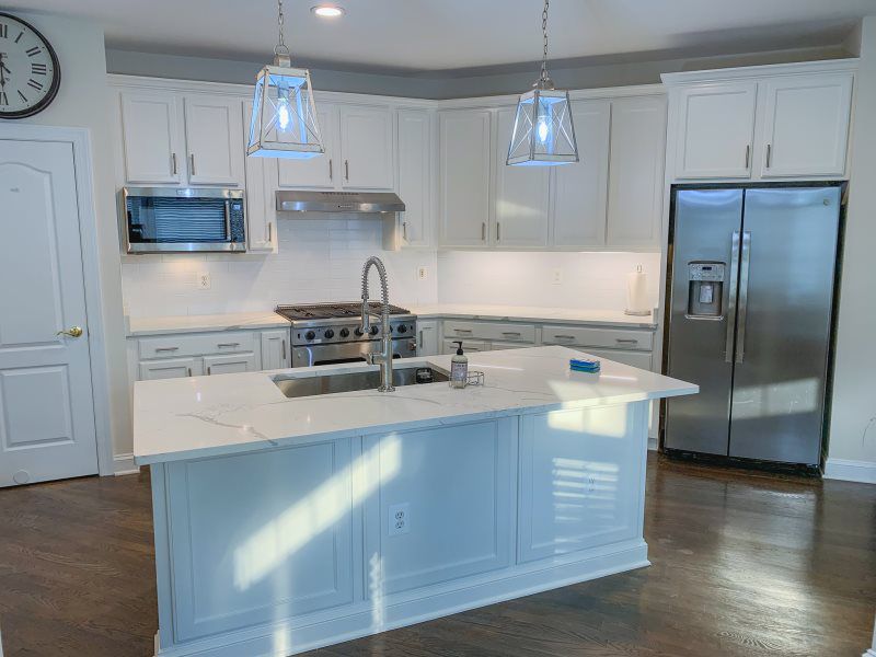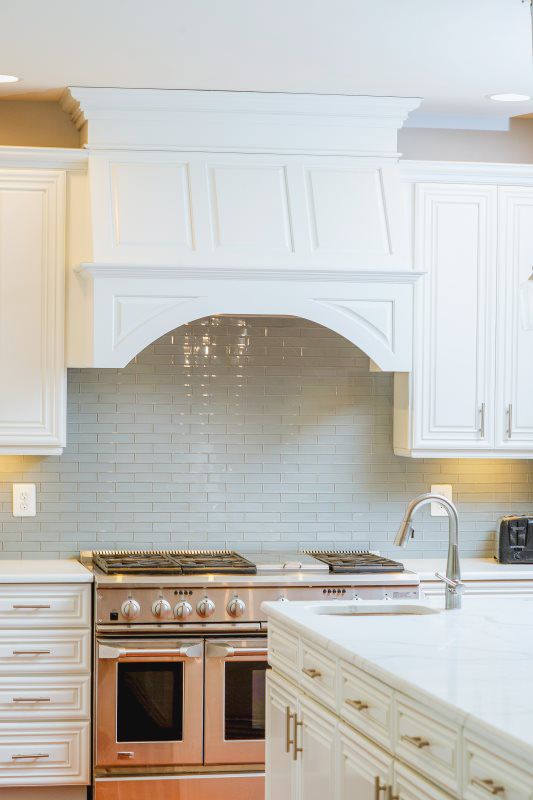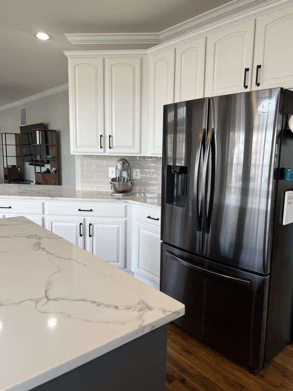 Replaced double wall oven cabinet, expanded the island with custom cabinets, end panels matching existing door profile, lowered island to base cabinet height, converted desk are to dry bar with custom cabinets, replaced countertop with calacatta arabescatto and backsplash with 3x12 White Ice Bright Color tile.